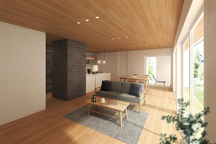たくさんの思い出を家族で共有できる、永く愛されるスタイルの家です。各部屋が近くにあることで家族の息づかいを感じることができ、コミュニケーションも円滑に。コンパクトながらも開放的な空間で、楽しい思い出が生まれます。ファサード面はシンプルな箱型で開口部をシンメトーに配置しました。また、玄関ポーチとウッドデッがひと続きになっているのも特徴です。